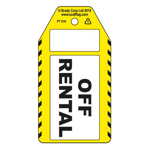 'Off Rental' tags clearly and easily inform the users of the ongoing status of the equipment ensurung that all are informed.  The tags are single sided with a hole punch to allow cable tie attachment.  There is a blank space at top to allow for overprinting with company logo.  Manufactured from 0.5 polypropylene the tag is extremely tear resistant, UV stablised and 100% recyclable