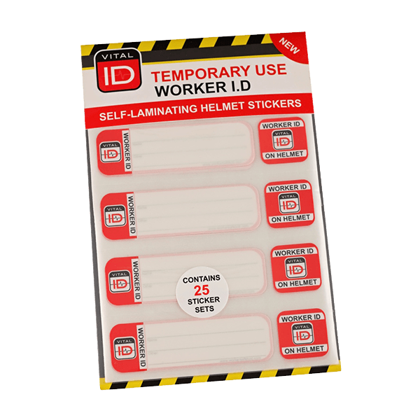 A low-cost solution to help site-foremen, supervisors, and managers quickly identify who is on site at a glance. These labels provide an ideal solution to identify for short-term workers, subcontractors or even visitors to a work site.   A temporary use self-laminating ID label that adheres to a hard-hat. Designed to clearly display useful basic information about a worker such as their name, company, profession, access authority or contact number.   Each pack contains 5 sheets of stickers, sufficient to equip 25 workers per pack.  Workers write their information on the ID Label, before sealing and protecting the information with a transparent laminate film that is waterproof and withstands abrasion. An additional label highlights the presence of the ID Label on the helmet.  In addition, the laminated ID can be used by workers to mark and identify their PPE